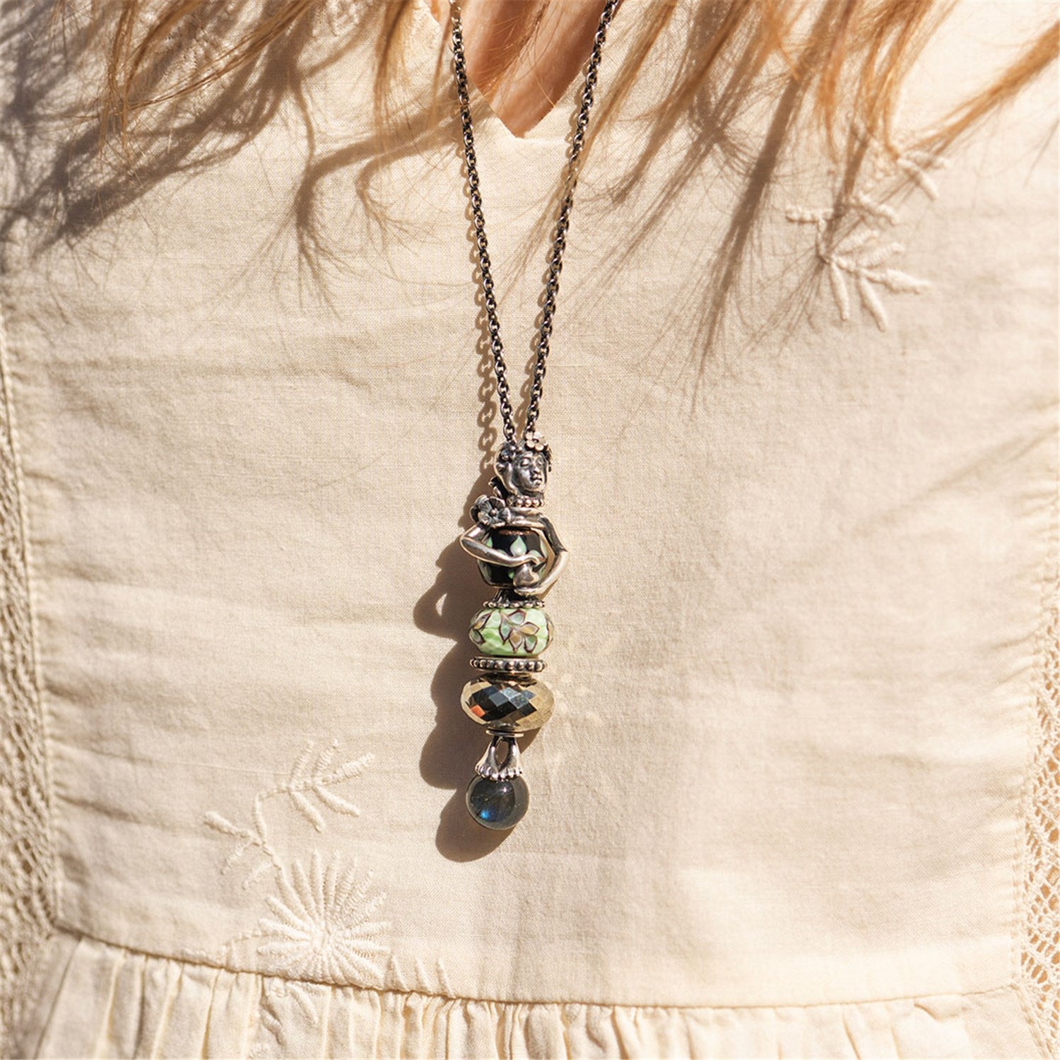 Play a round with freshwater pearls, shimmering glass, smooth- or facetted gemstone beads and place at the heart of the necklace, for the Guardian of Love to hold and protect.