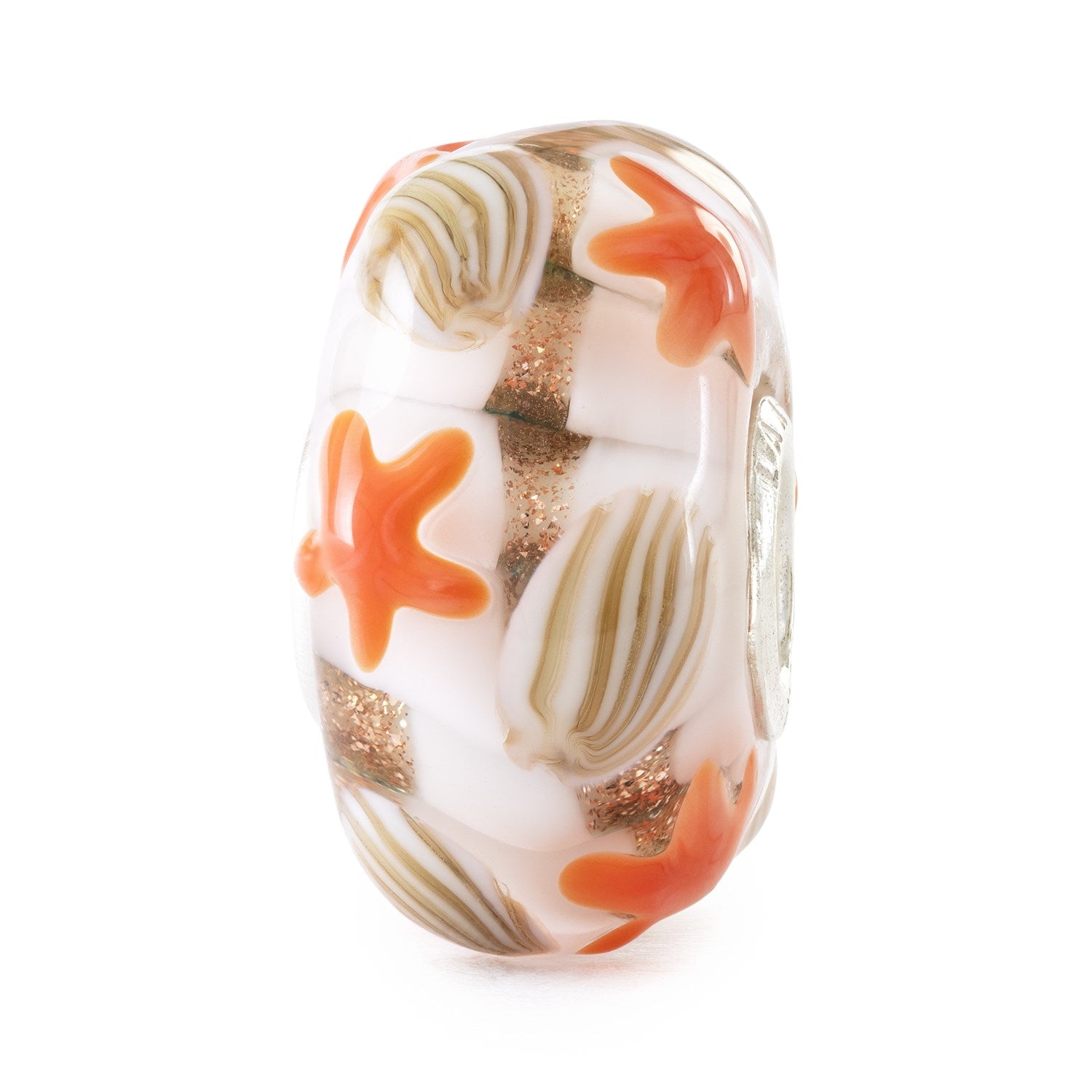 In the deeper glass layers of this bead, you'll find soft color tones and golden glitter in flowing forms. In the upper layers, small orange starfish rest gently. This glass bead will dance in the sunlight!