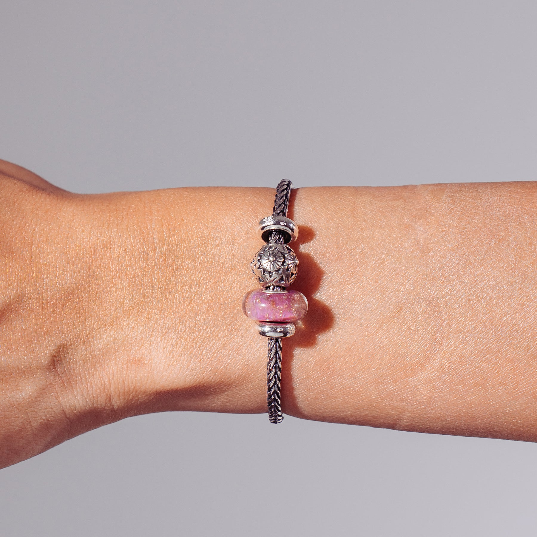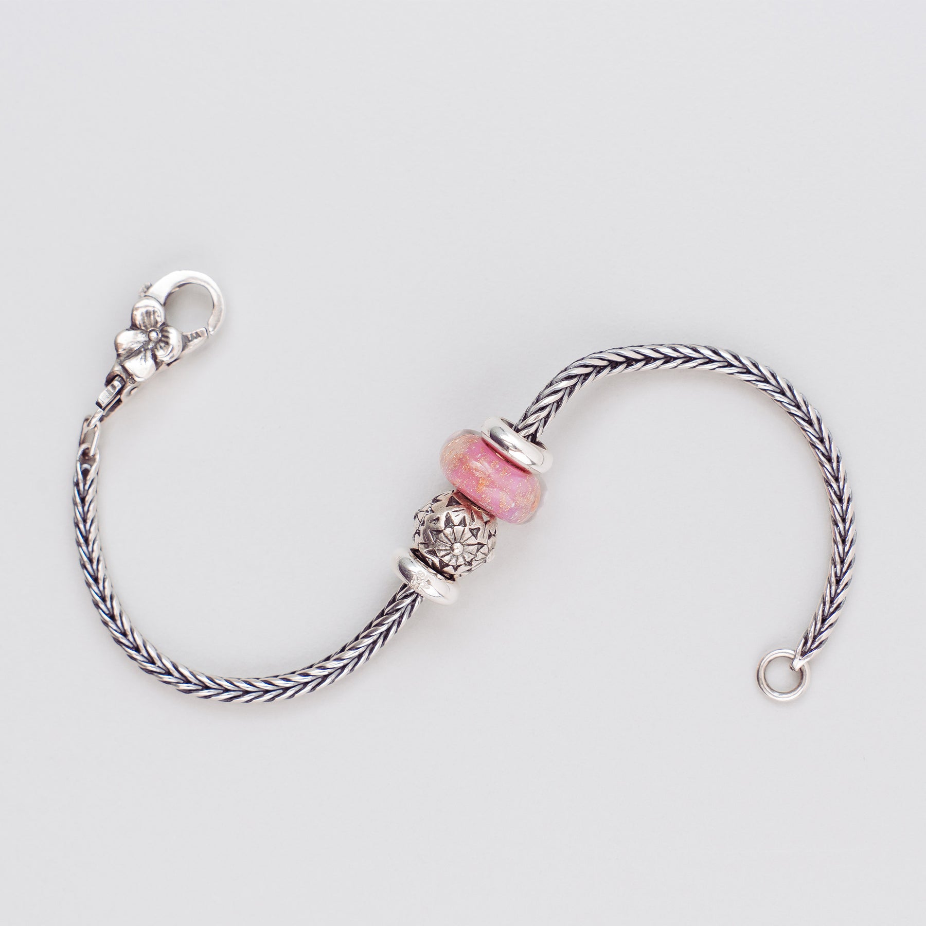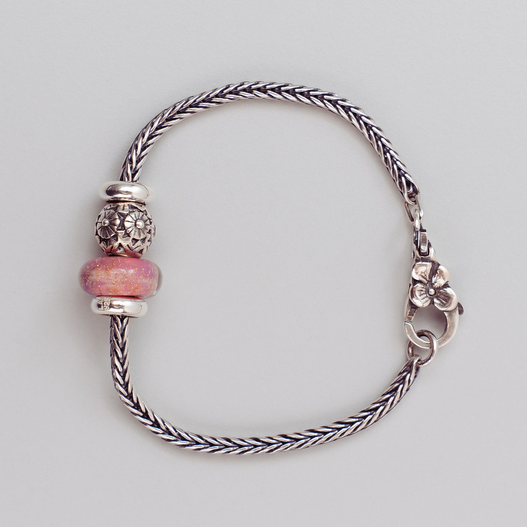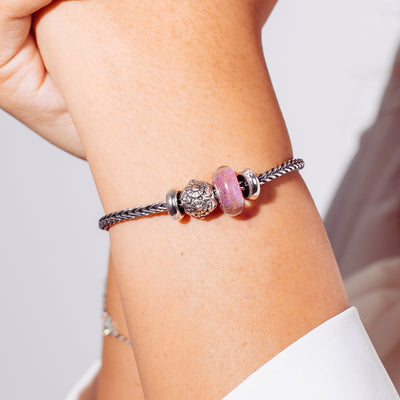 The Pink Desert Bracelet by Trollbeads is a sophisticated blend of warm tones and elegant silverwork. At its center is the shimmering Pink Desert Bead, paired with the bold Black Flower Bead, creating a striking contrast of softness and strength. Two polished Silver Spacers frame the design on a classic Sterling Silver Bracelet.