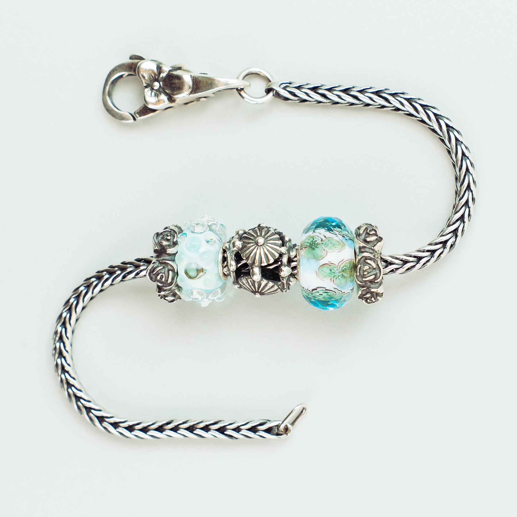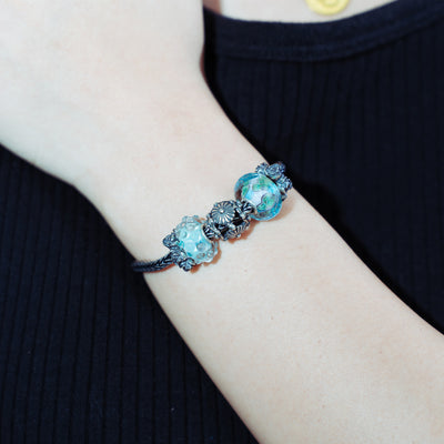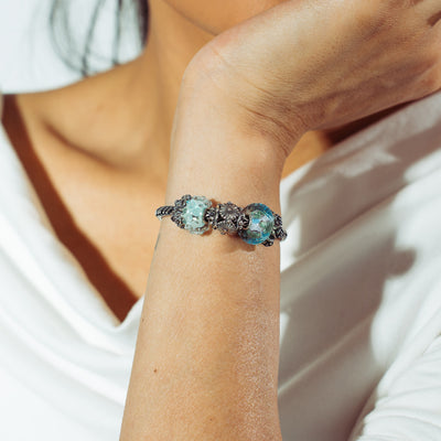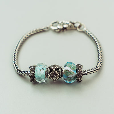The Still Life Bracelet by Trollbeads is a poetic tribute to nature's quiet elegance. Featuring the faceted Beauty in Blue Bead, the textured Daisy Chance Bead, and the serene Sea View Bead, this set balances glass artistry with intricate silverwork. Two detailed Rose Spacers provide a romantic touch, all strung on a durable Sterling Silver Bracelet.