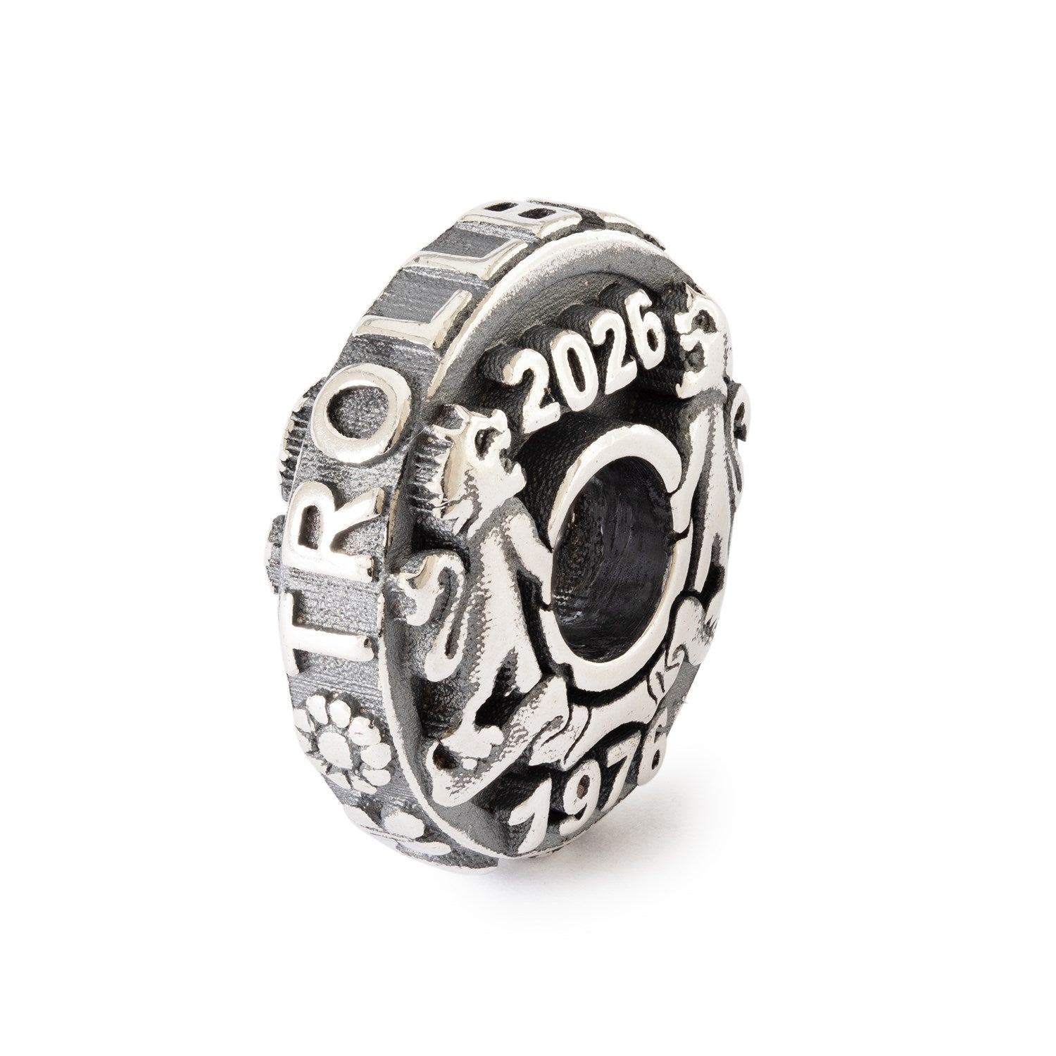 The bead has a slim coin-like shape and the year 1976 and 2026 engraved on the side, along with the Trollbeads logo. On the rim, 'Trollbeads' is engraved along with different symbols.